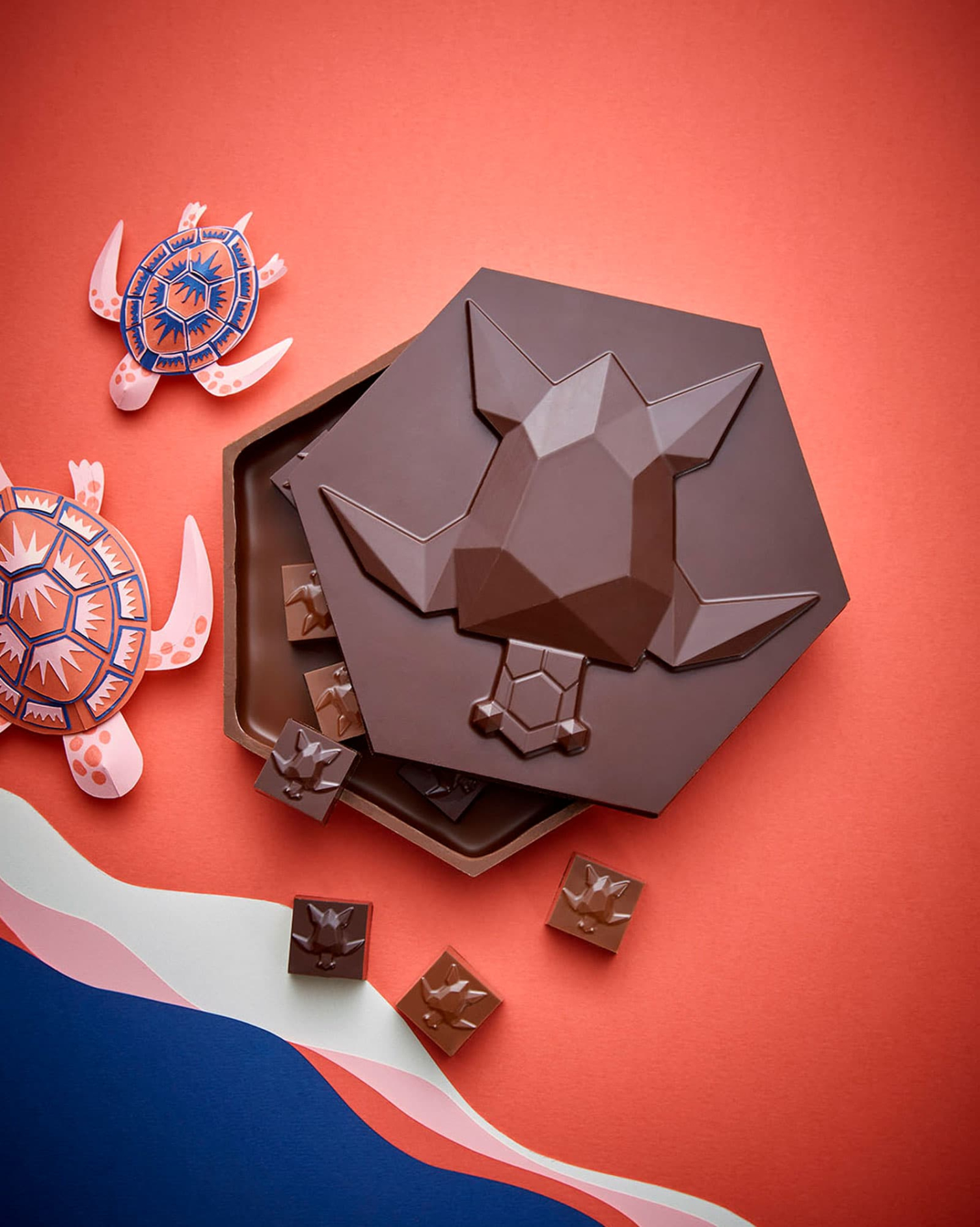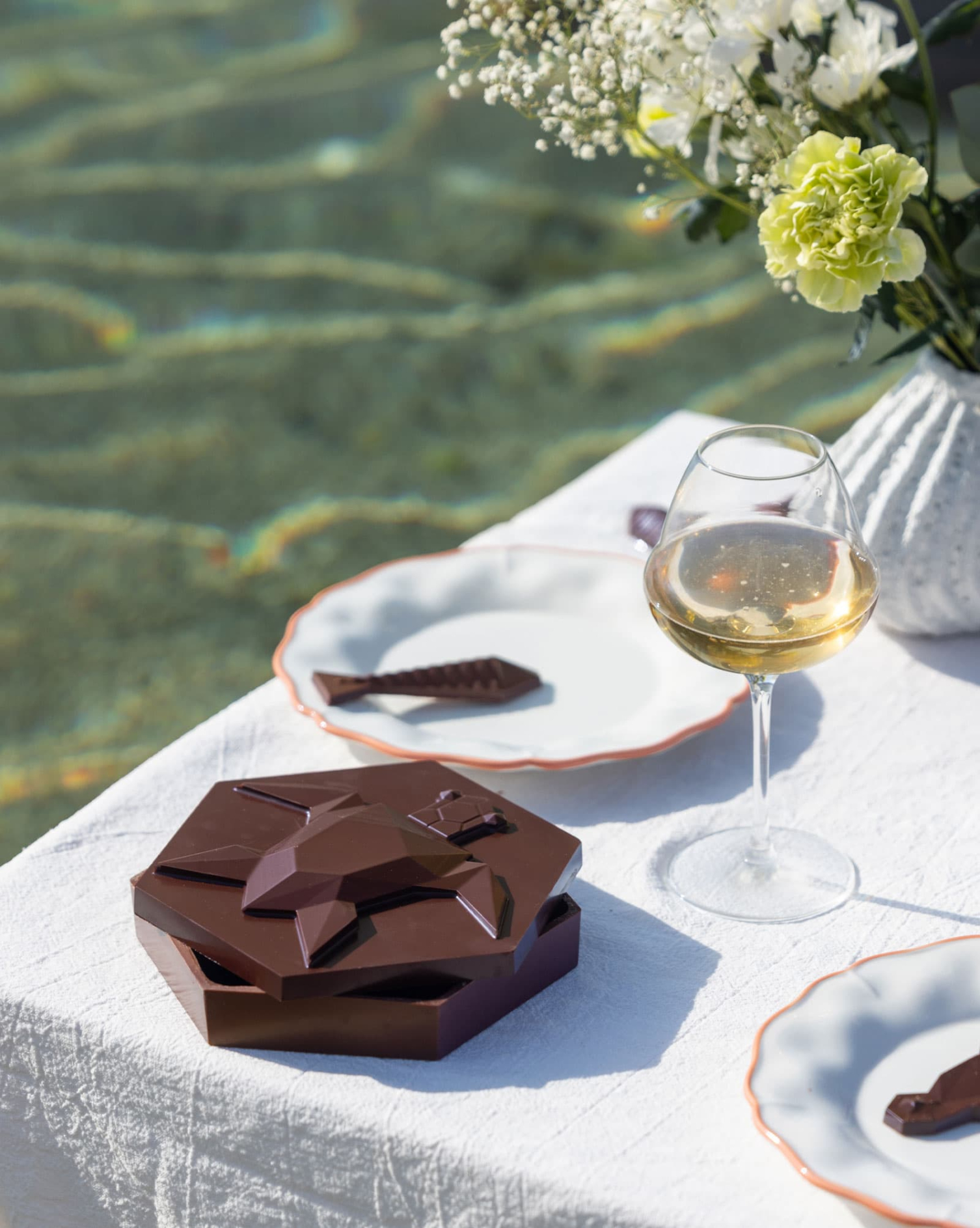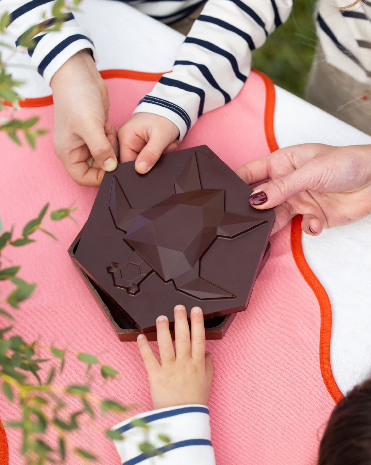 Eine beeindruckende Kreation zum Mitmachen: Mit Ihren Baumwollhandschuhen können Sie die Bonboniere ausgehend vom Sockel und vom Deckel selbst aufbauen. Es gibt eine Ausführung in Zartbitterschokolade Assemblage Signature 75 % und eine andere in Milchschokolade Madagaskar 45 %. Und denken Sie auch an die kleinen Schildkröten-Nuggets aus Vanille-Marshmallow und Haselnuss-Praliné und an die Glocke aus Kokosnuss-Praliné, die ebenfalls in Zartbitter- und in Milchschokolade verfügbar sind.