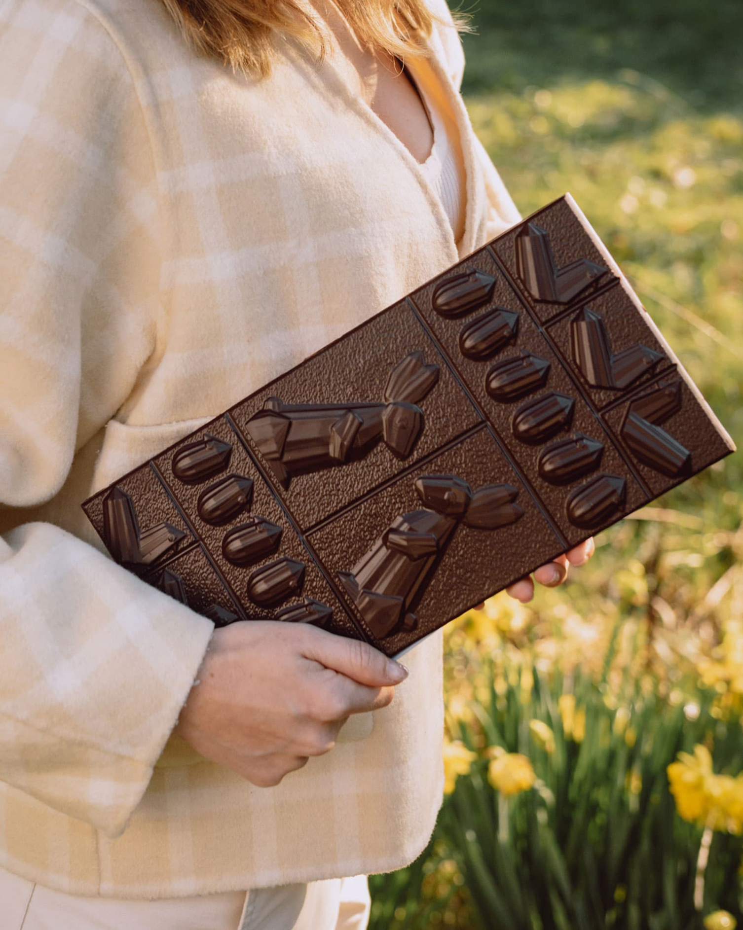 Jeder Bissen dieser unglaublich köstlichen Tafelschokolade weist drei Texturen auf: seidiges und intensives Vanille-Karamell, unglaublich cremiges Haselnuss-Vanille-Praliné und karamellisierte herrlich knusprige Haselnusssplitter. Neugierige Kaninchen, kokette Hühner und knackige „Kakaoschoten-Küken“: Alle Tiere der Kakaoschotenfarm haben sich verabredet, um ihre einfachen Silhouetten auf diese Tafelschokolade zu drucken. Zweifellos das Herzstück Ihres Osterkorbs!