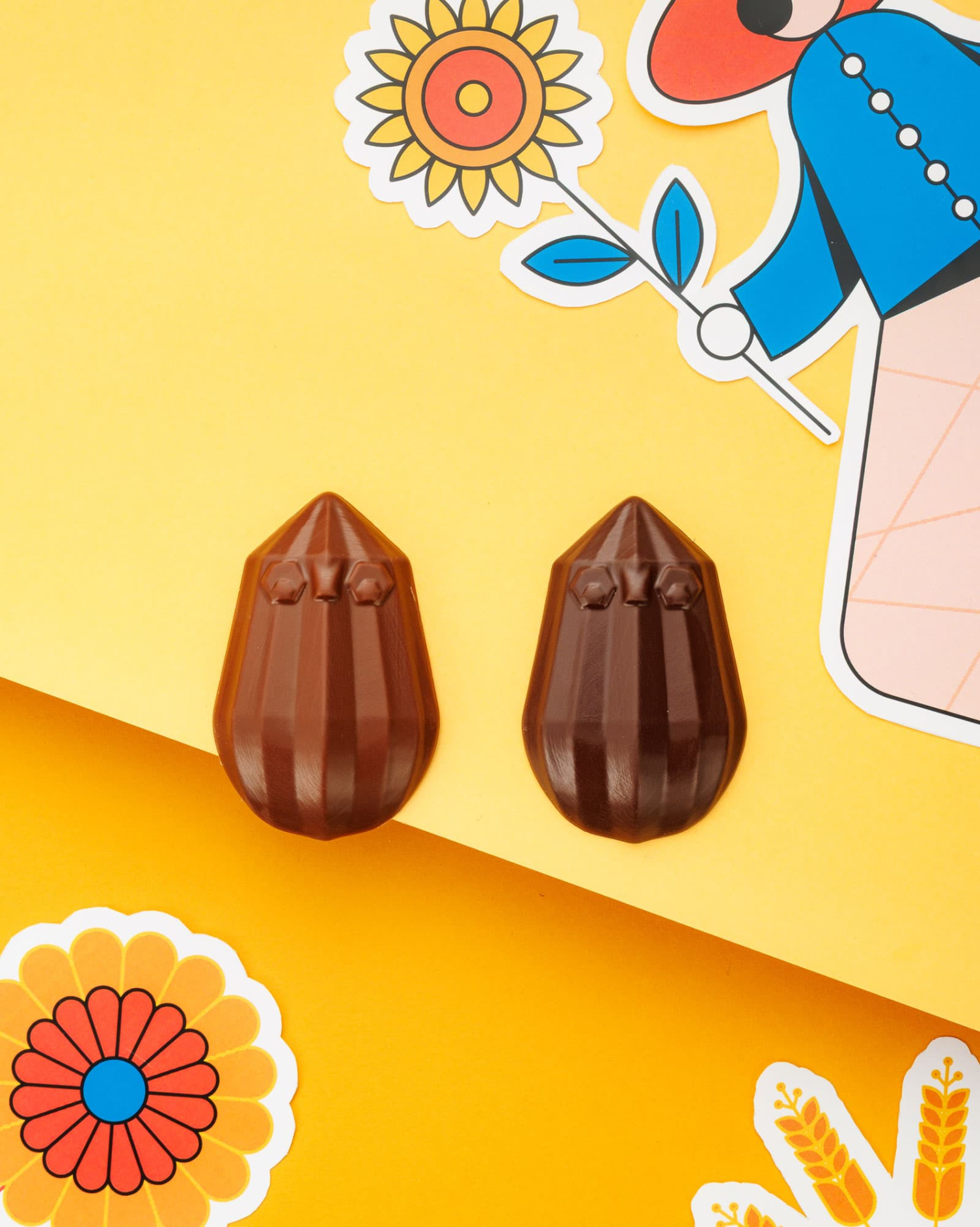 Repérez les cachettes, préparez vos paniers ! Ensachés individuellement, ces mini caboussins (mi-cabosses, mi-poussins), sont le format parfait à glisser dans vos cachettes pour préparer votre chasse aux œufs. Pour satisfaire tous les palais, retrouvez cinq pièces en chocolat au lait 45% et cinq pièces en chocolat noir 75%. Bonne nouvelle, nous vous glissons une onzième création surprise dans votre commande.