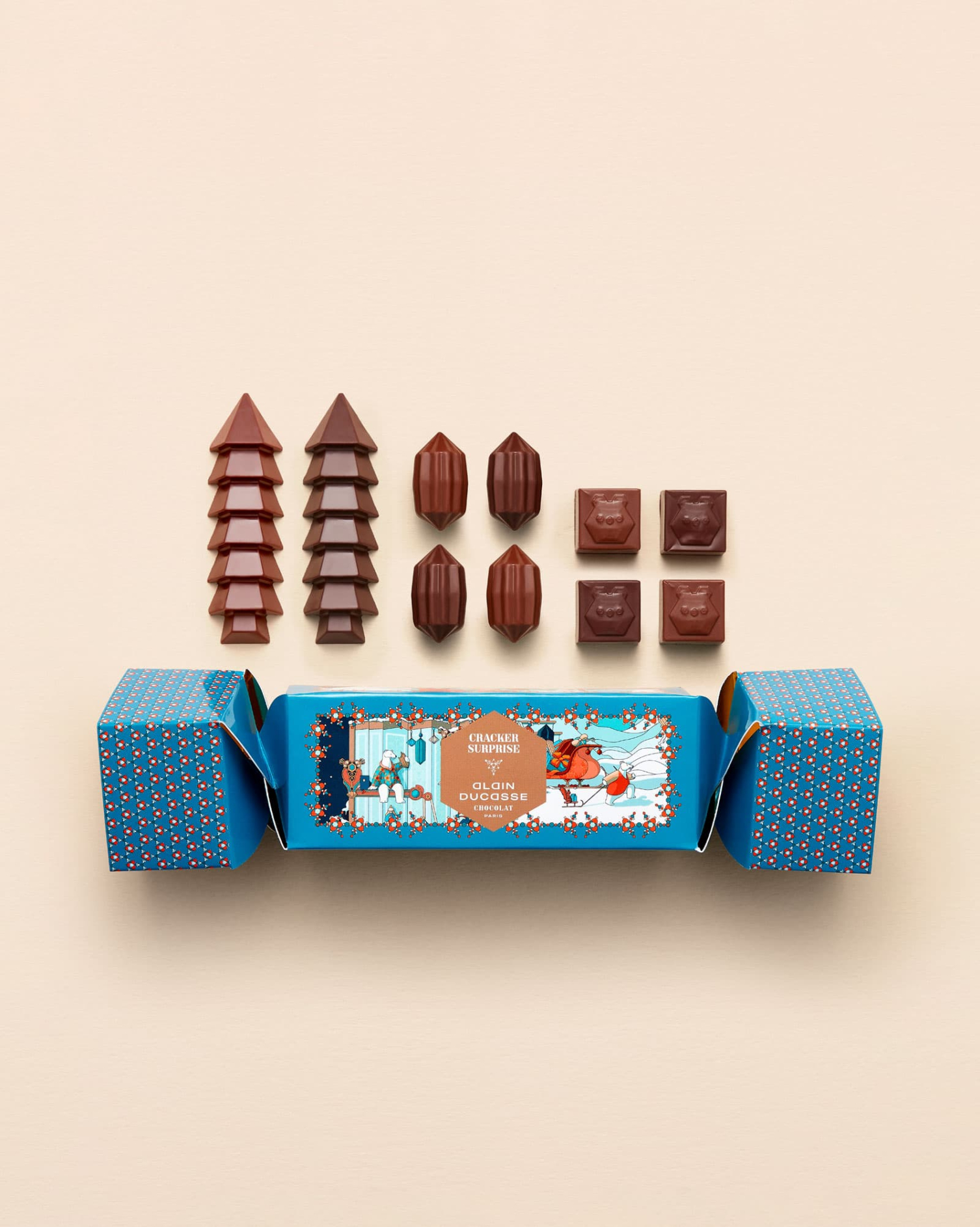 On vous souhaite de remporter la papillote, car voici les merveilles qu’elle contient : trois pépites oursons au praliné noisettes de Naples et fleur de sel, croustillant et régressif ; trois mini cabosses au praliné noix de coco, au goût intense et généreux ; et deux sapins au praliné noisettes de Naples, à la texture lisse et fondante qui libère toute la richesse aromatique des fruits secs.