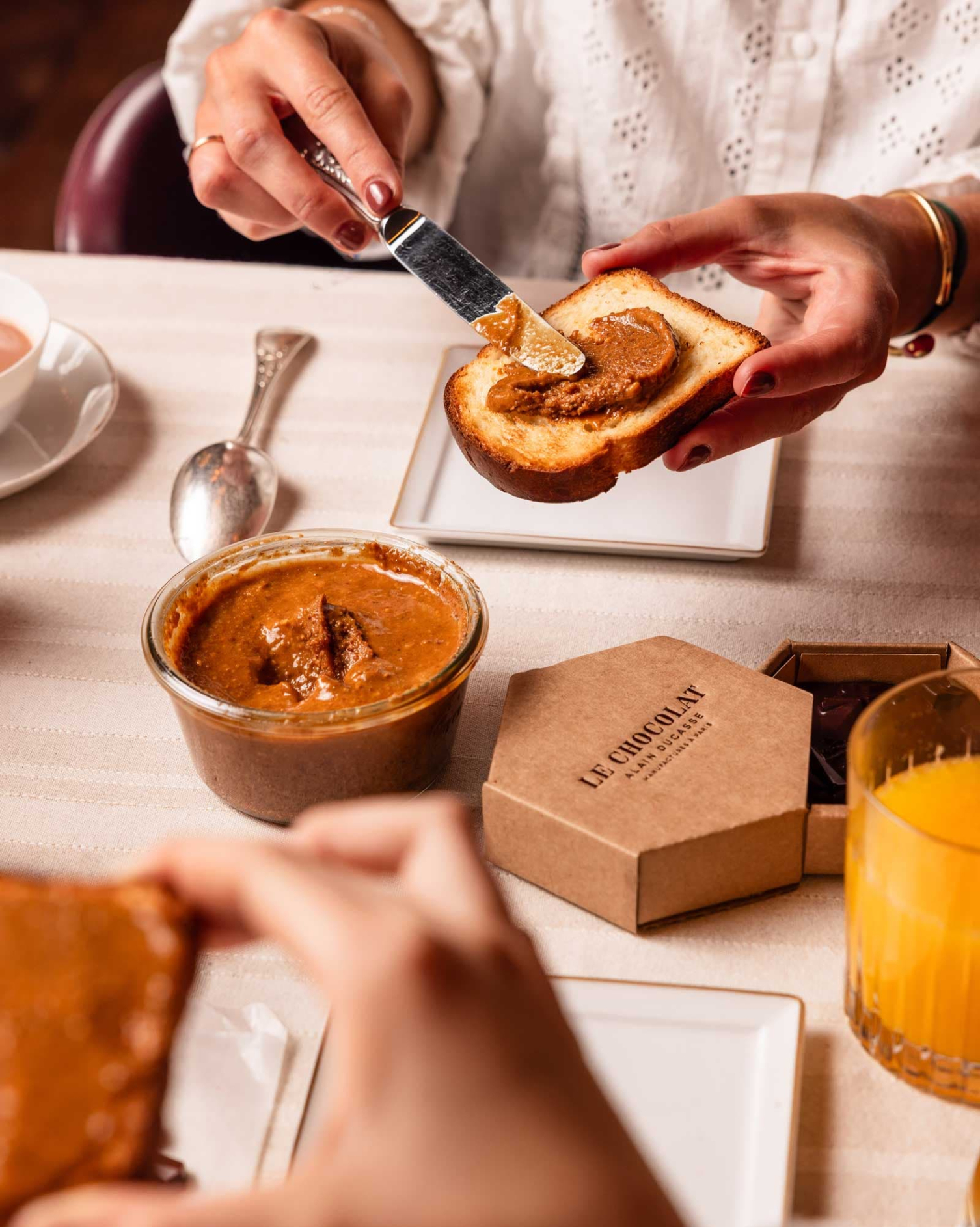 qui garnissent plusieurs de nos créations, le praliné noisette à tartiner offre cette texture légèrement granuleuse qui a un goût de reviens-y, et plutôt dix fois qu’une.