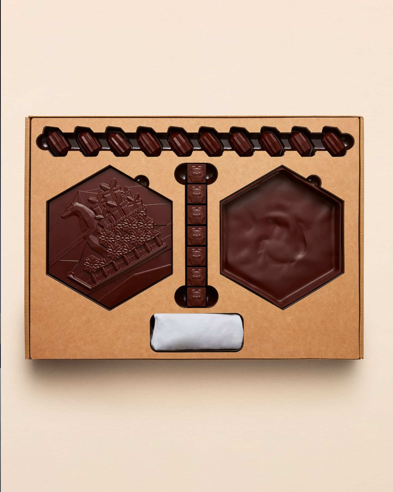 The star of this creation is the Manufacture’s iconic praliné, offered in two equally irresistible recipes. On one side, mini pods filled with cocoa nib praliné, smooth and melting in texture, releasing and intensifying the flavors. On the other, teddy bear bites with Sicilian almond praliné and fleur de sel—crisp and delightfully nostalgic.