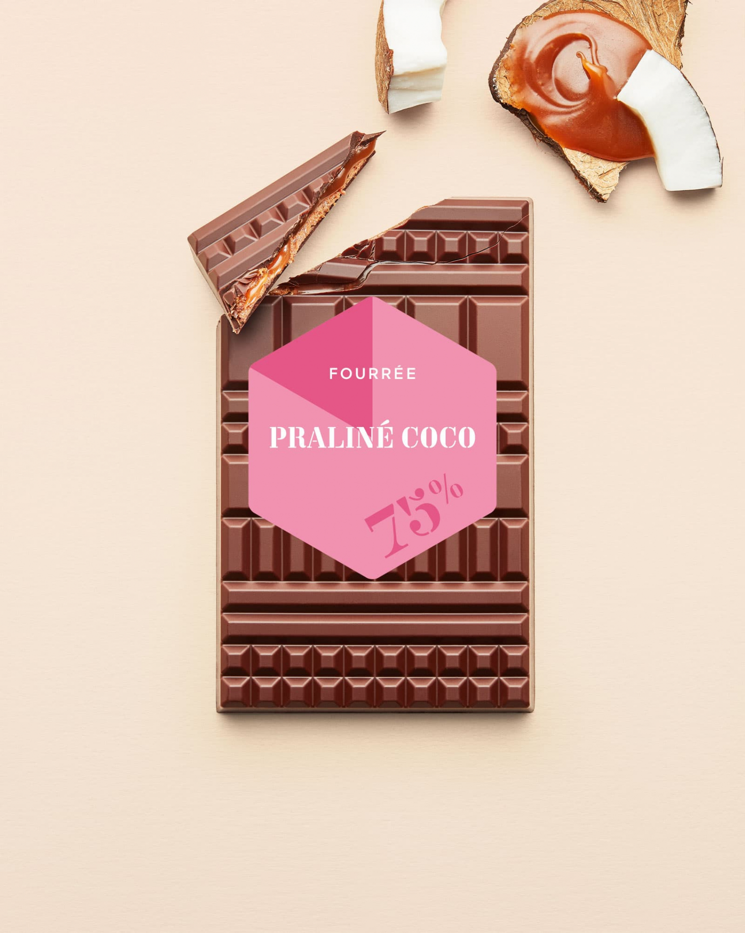 This 75% Signature Blend dark chocolate bar is filled with two preparations made by our chocolate craftsmen. First a praliné with roasted coconut and almonds, then a caramel, also with coconut. The crunchiness of the praliné and the smoothness of the caramel combined to the crisp of the chocolate layers create a delicious game of textures, for a great moment of indulgence.