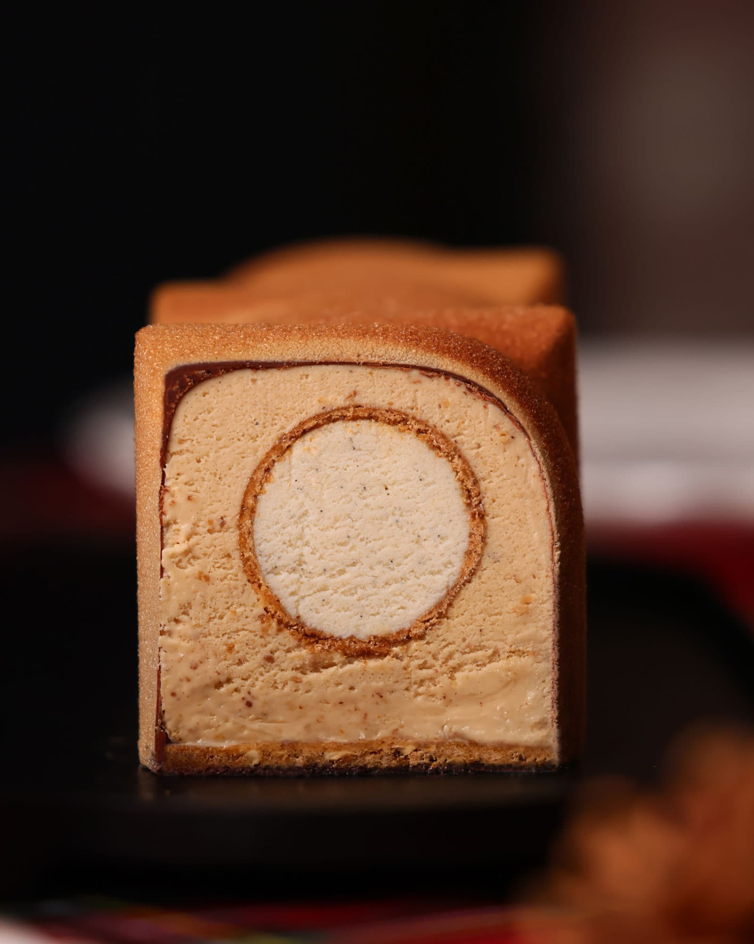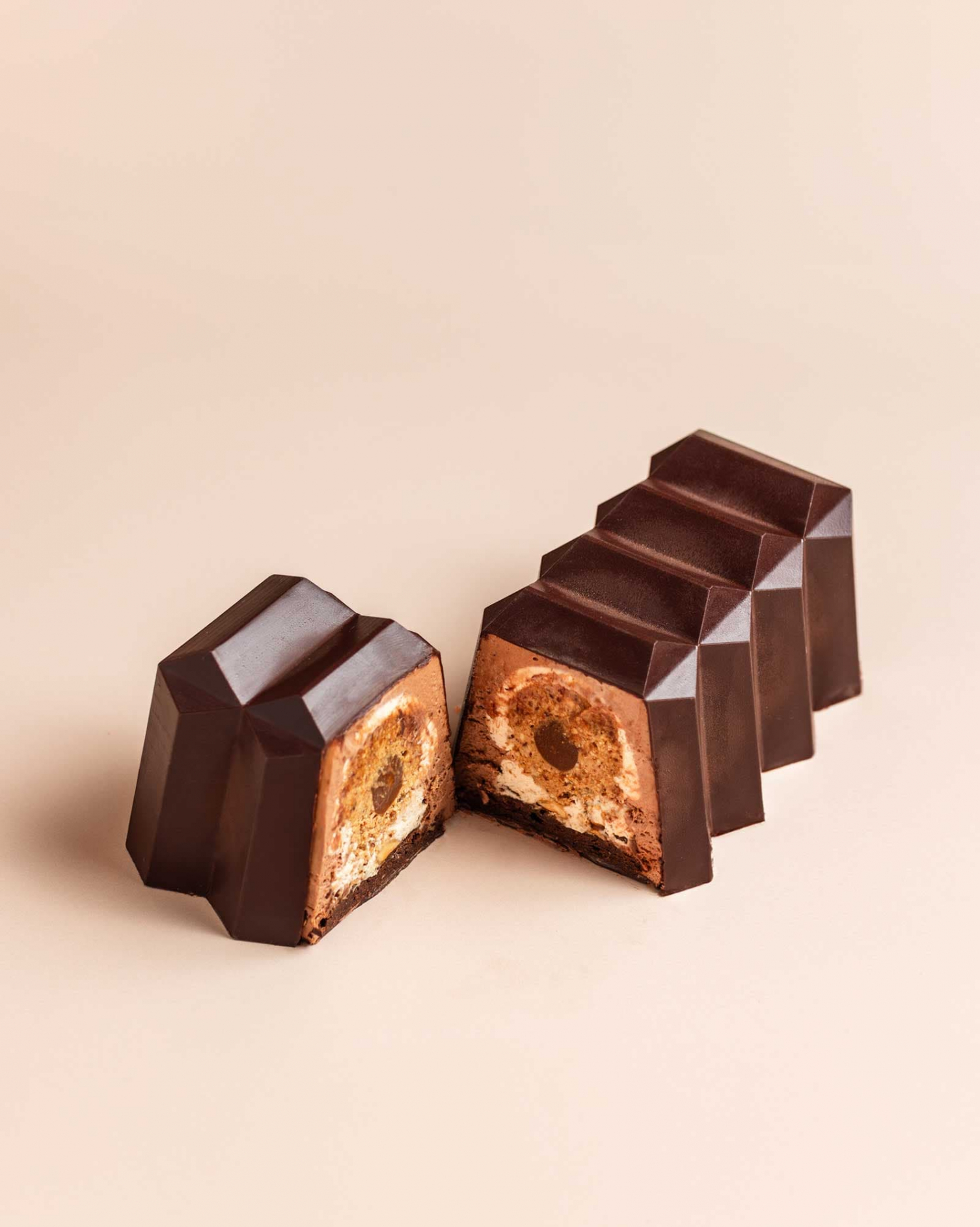 Discover our inaugural limited edition signature yule log. A striking symmetric design inspired by rotating Ds featuring a subtle combination of soft chocolate biscuit, crunchy praliné, and Vanilla from Madagascar and Java 75% chocolate ice creams... and delicately flocked with crystallized cocoa nibs. A play on textures and flavours, sweetened with precision. A creation by Pierre Tachon.